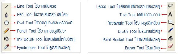 | หมายเลข 5 คือ | Timeline หน้าต่างแสดงเส้นควบคุมเวลาสำหรับการนำเสนอผลงาน ประกอบด้วยส่วนทำงาน เกี่ยวกับ Layer และ Timeline |